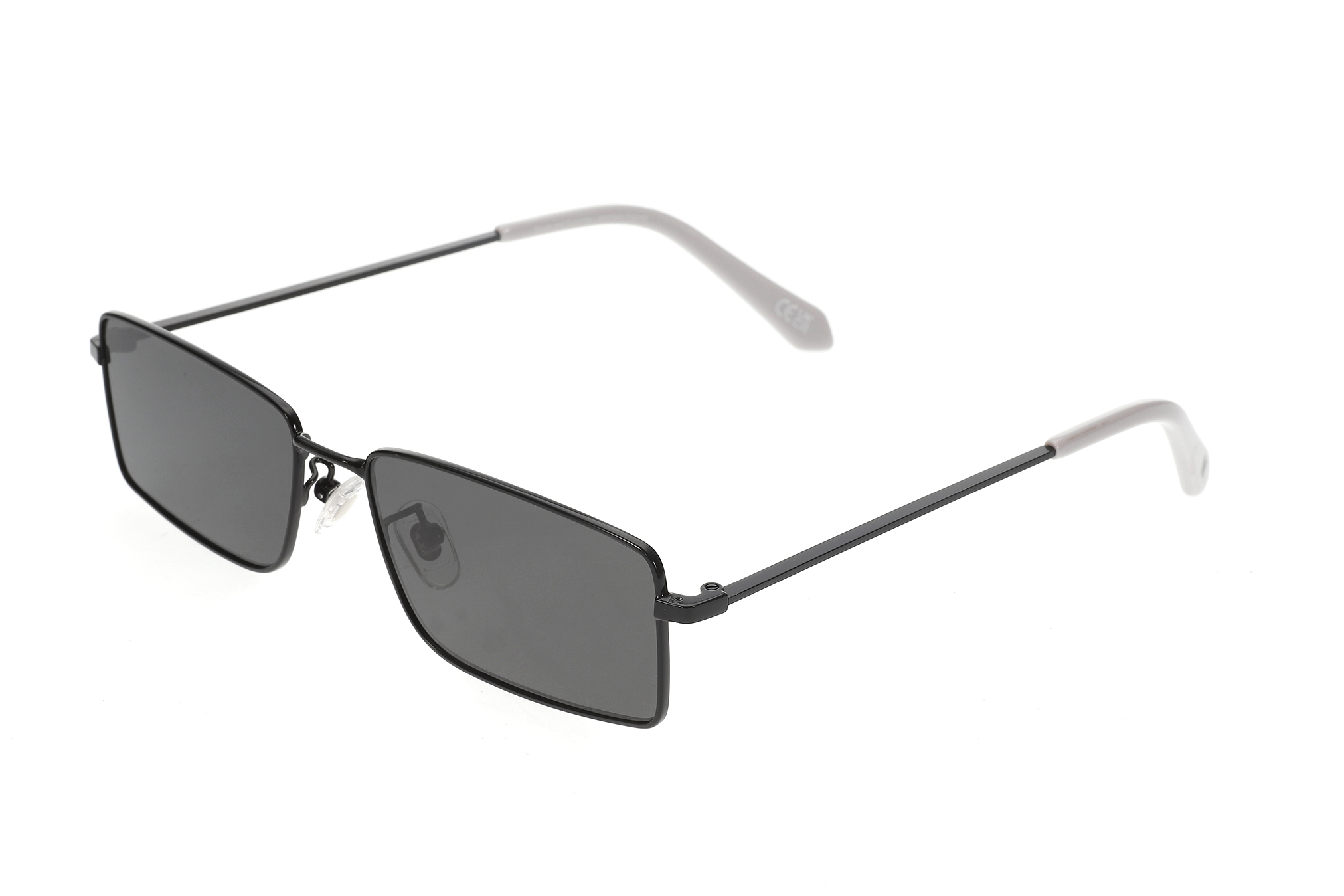Sunglasses featuring a black metal frame with a sharp, angular silhouette and finished with white acetate temple tips. Paired with dark grey semi-flat lenses for a bold, modern street aesthetic. Designed with adjustable clear silicone nose pads for all-day comfort and a lightweight metal construction for effortless wear. The lenses provide UV400 protection against harmful UVA and UVB rays and feature an anti-reflective inside coating. Includes a premium hard case and microfiber cleaning cloth.