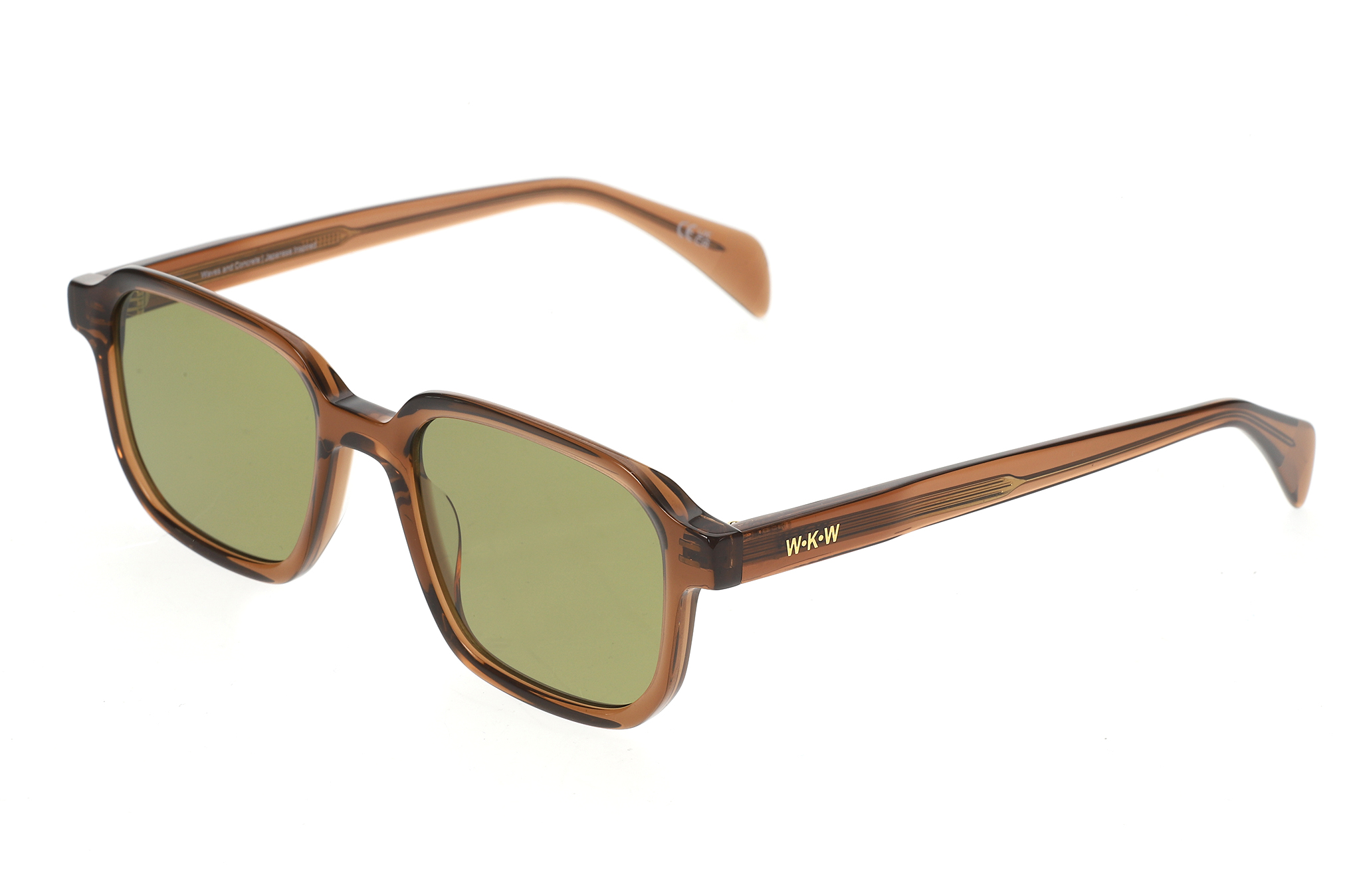 Sunglasses featuring a transparent brown acetate frame with a clean, structured silhouette. Paired with green-tinted lenses for a striking, contemporary aesthetic. Designed with an integrated acetate nose bridge for a comfortable fit and a lightweight construction for everyday wear. The lenses provide UV400 protection against harmful UVA and UVB rays and feature an anti-reflective inside coating. Includes a premium hard case and microfiber cleaning cloth.