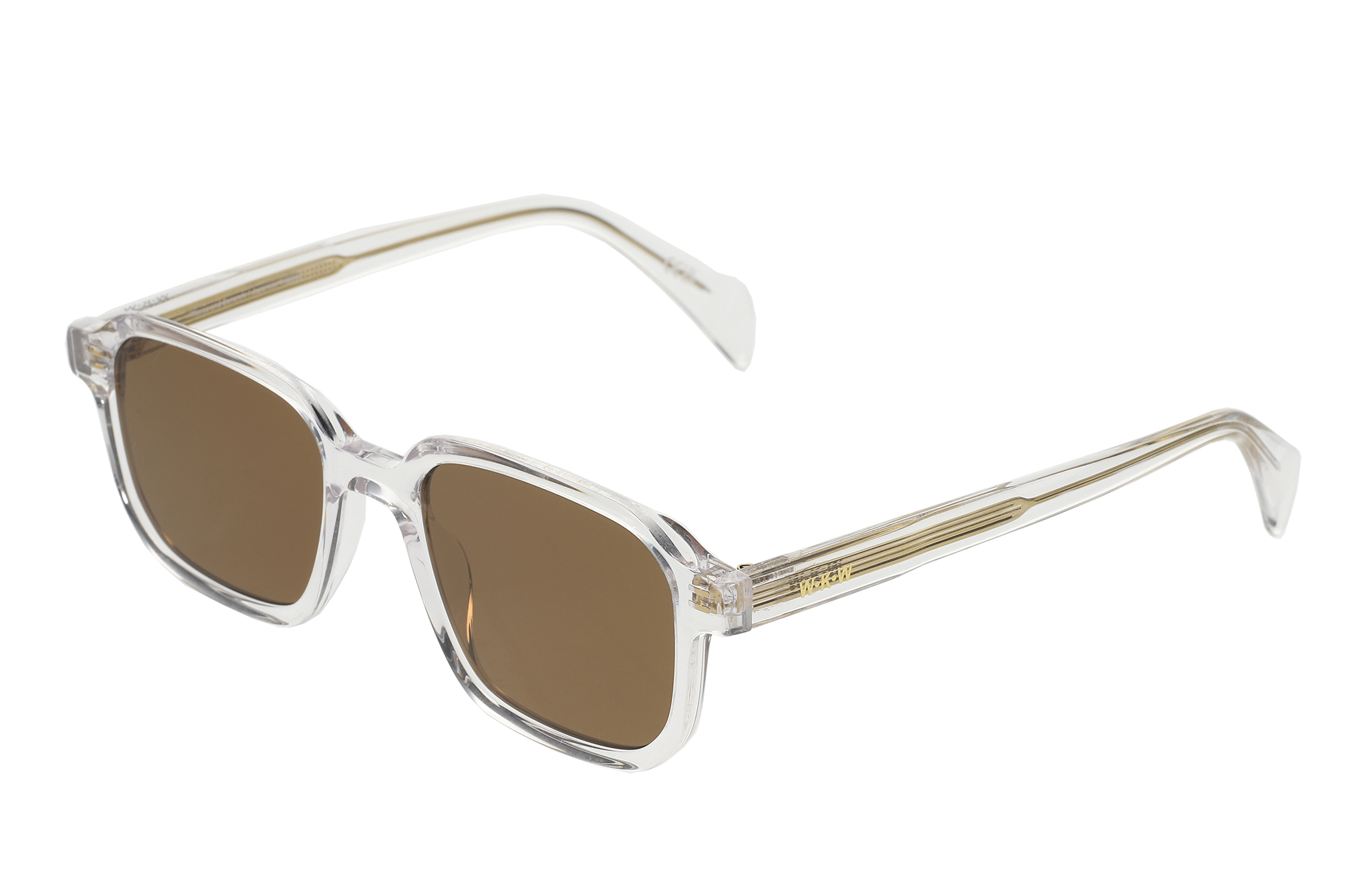 Sunglasses featuring a transparent acetate frame with refined gold-tone metal accents and a clean, structured silhouette. Paired with brown-tinted lenses for a striking, contemporary aesthetic. Designed with an integrated acetate nose bridge for a comfortable fit and a lightweight construction for everyday wear. The lenses provide UV400 protection against harmful UVA and UVB rays and feature an anti-reflective inside coating. Includes a premium hard case and microfiber cleaning cloth.
