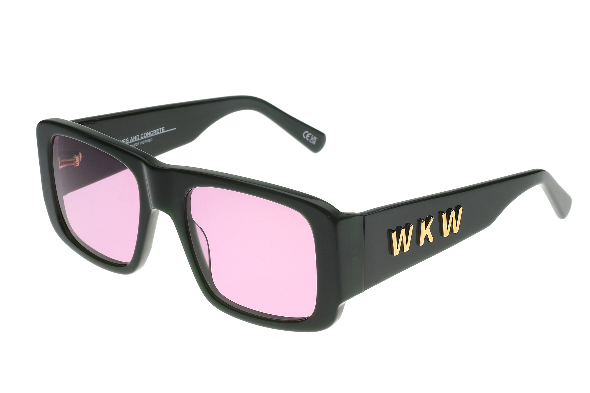 Sunglasses featuring a deep green acetate frame with a bold, sculpted silhouette. Paired with pink-tinted lenses that create a strong visual contrast and a confident overall presence. Designed for a secure, comfortable fit and a solid yet wearable construction for everyday use. The lenses provide UV400 protection against harmful UVA and UVB rays and feature an anti-reflective inside coating. Includes a premium hard case and microfiber cleaning cloth.
