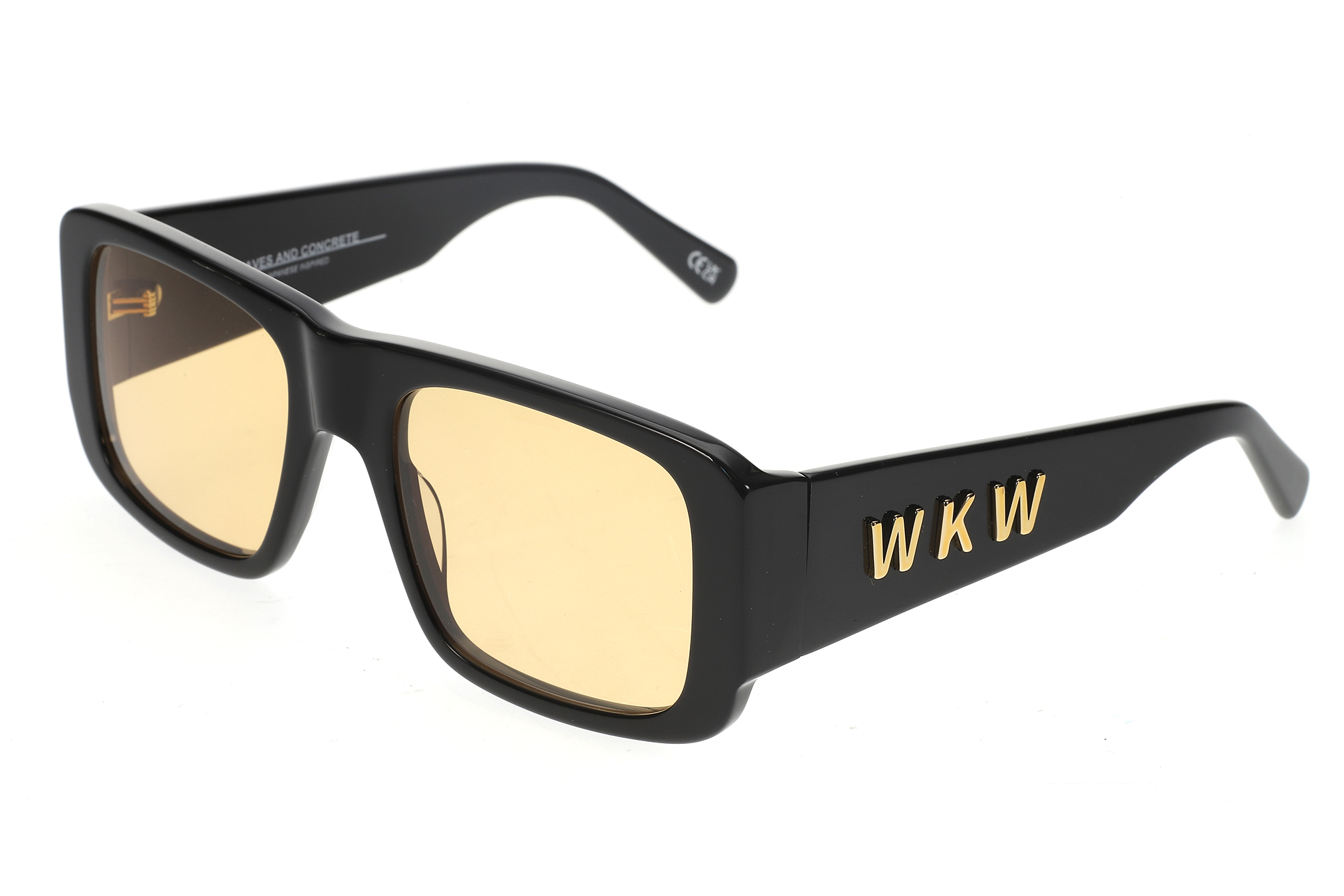 Sunglasses featuring a shiny black acetate frame with a bold, sculpted silhouette. Paired with light orange-tinted lenses that create a strong visual contrast and a confident overall presence. Designed for a secure, comfortable fit and a solid yet wearable construction for everyday use. The lenses provide UV400 protection against harmful UVA and UVB rays and feature an anti-reflective inside coating. Includes a premium hard case and microfiber cleaning cloth.