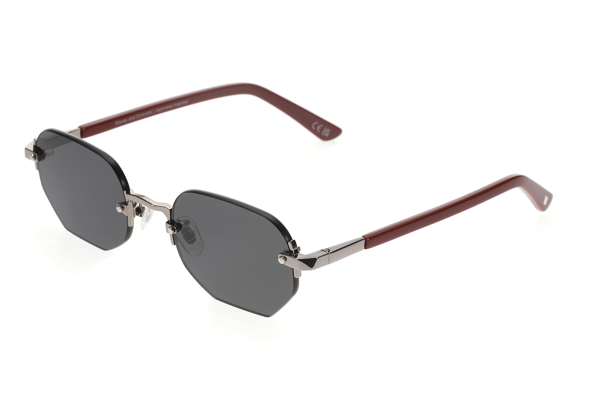Sunglasses featuring a silver-tone metal frame with a sharp, geometric silhouette and deep red acetate temples for subtle contrast. Paired with dark grey-tinted lenses that bring a fresh, vibrant visual tone. Designed with adjustable clear silicone nose pads for a secure, comfortable fit and a lightweight construction suitable for everyday wear. The lenses provide UV400 protection against harmful UVA and UVB rays and feature an anti-reflective inside coating. Includes a premium hard case and microfiber cleaning cloth.