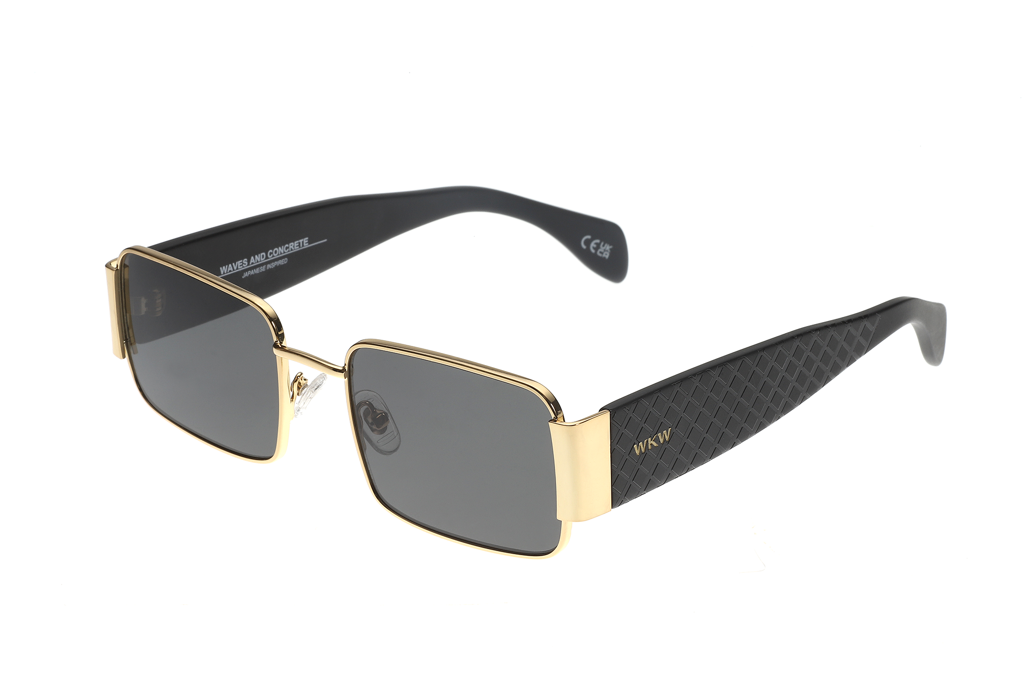 Sunglasses featuring a gold-tone metal frame with a sleek, rectangular silhouette and bold black textured temples for a distinctive contrast. Paired with grey-tinted lenses that deliver a sharp, modern edge to the overall look. Designed with adjustable clear silicone nose pads for a secure, comfortable fit and a lightweight yet durable metal construction for effortless everyday wear. The lenses offer UV400 protection against harmful UVA and UVB rays and feature an anti-reflective inside coating. Includes a premium hard case and microfiber cleaning cloth.
