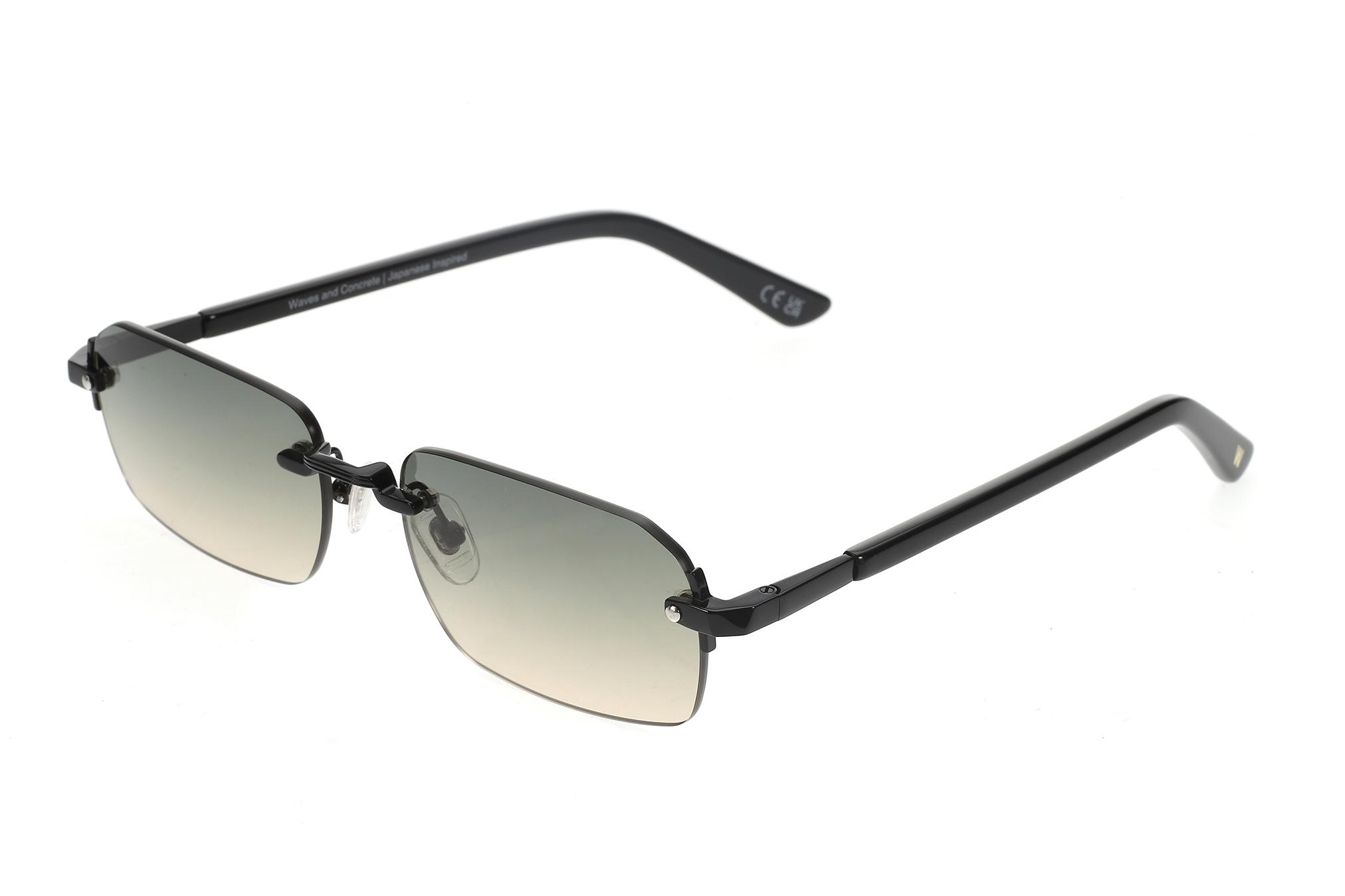 Rimless sunglasses featuring a black metal frame with a sharp, geometric silhouette and black acetate temples for the perfect match. Paired with gradient lenses transitioning smoothly from green to yellow tones that deliver a clean, modern look with understated attitude. Designed with adjustable clear silicone nose pads for a secure, comfortable fit and a lightweight metal construction for effortless everyday wear. The lenses provide UV400 protection against harmful UVA and UVB rays and feature an anti-reflective inside coating. Includes a premium hard case and microfiber cleaning cloth.